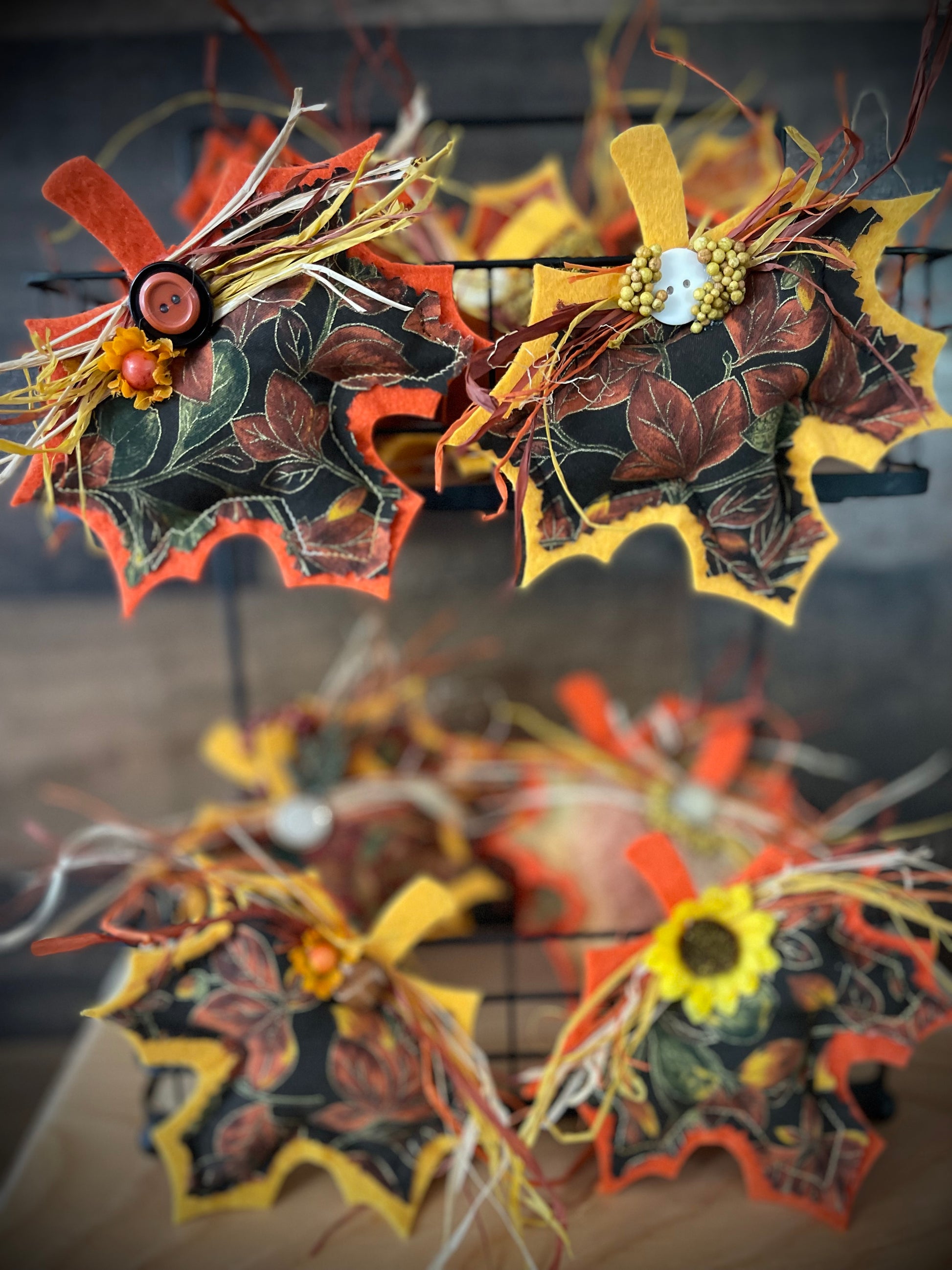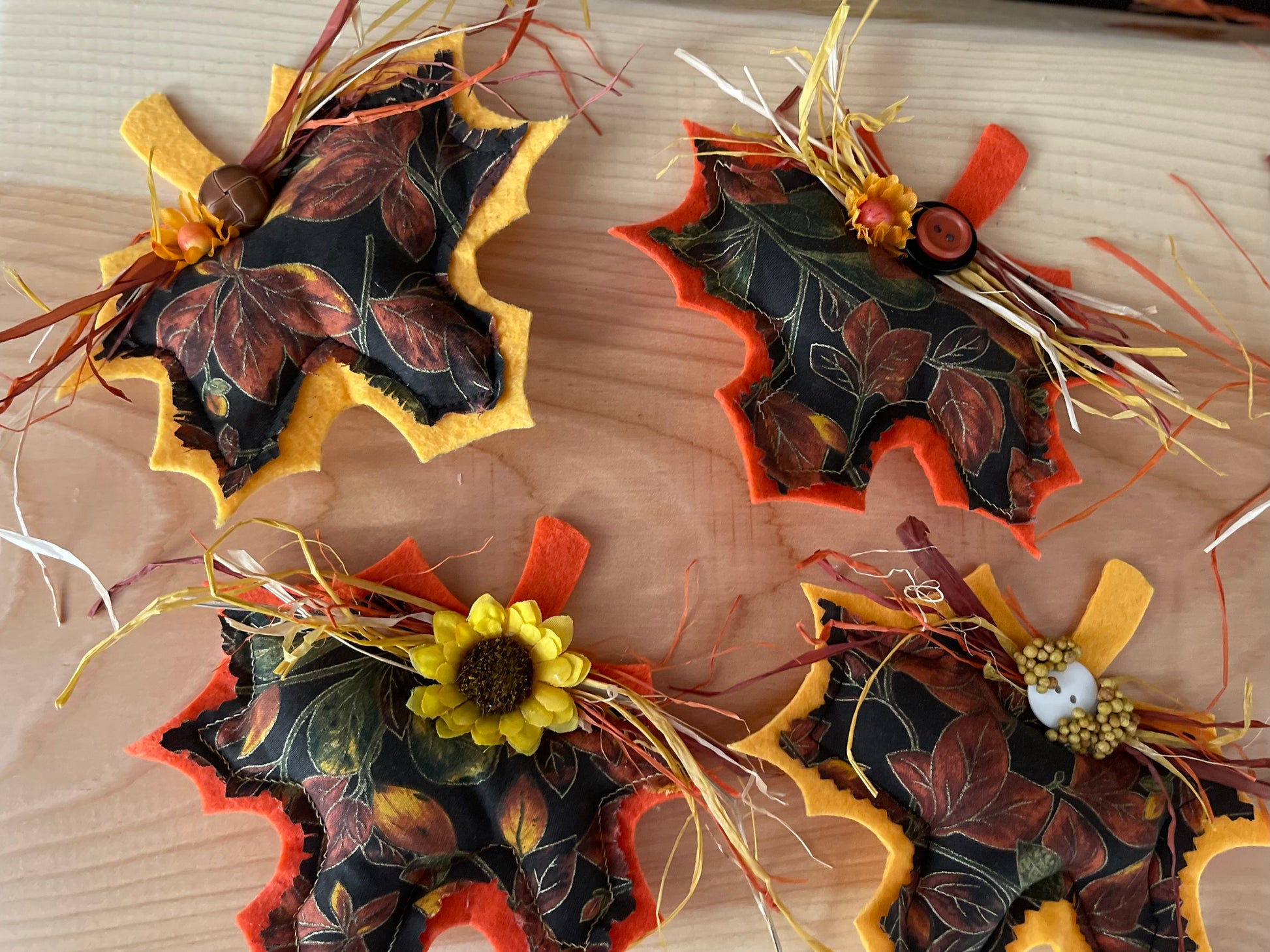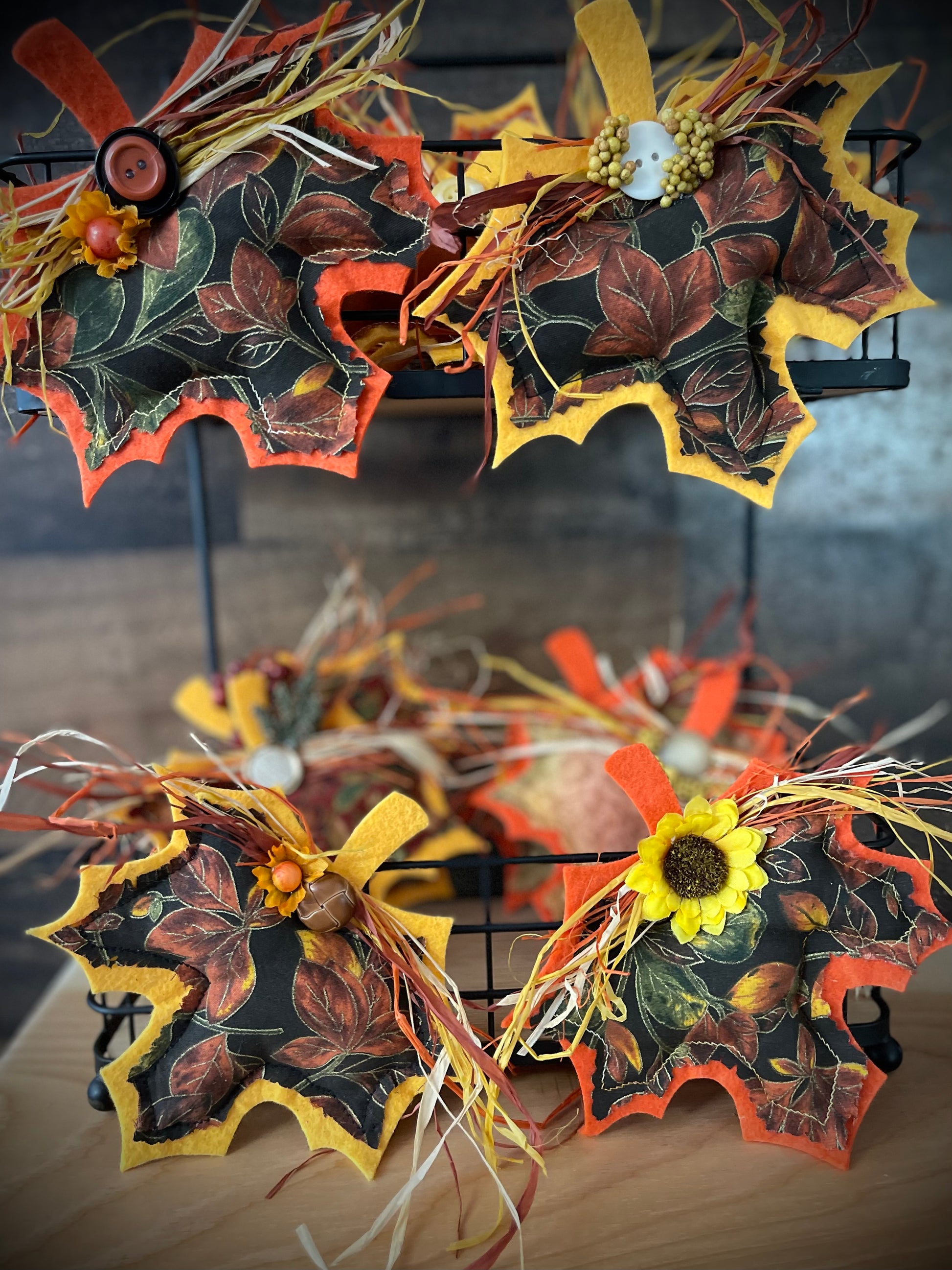 Handcrafted: stitched, decorated, and fiber filled “puff” felt decor in leaf or pumpkin shapes to add some rustic charm to your Fall decor!