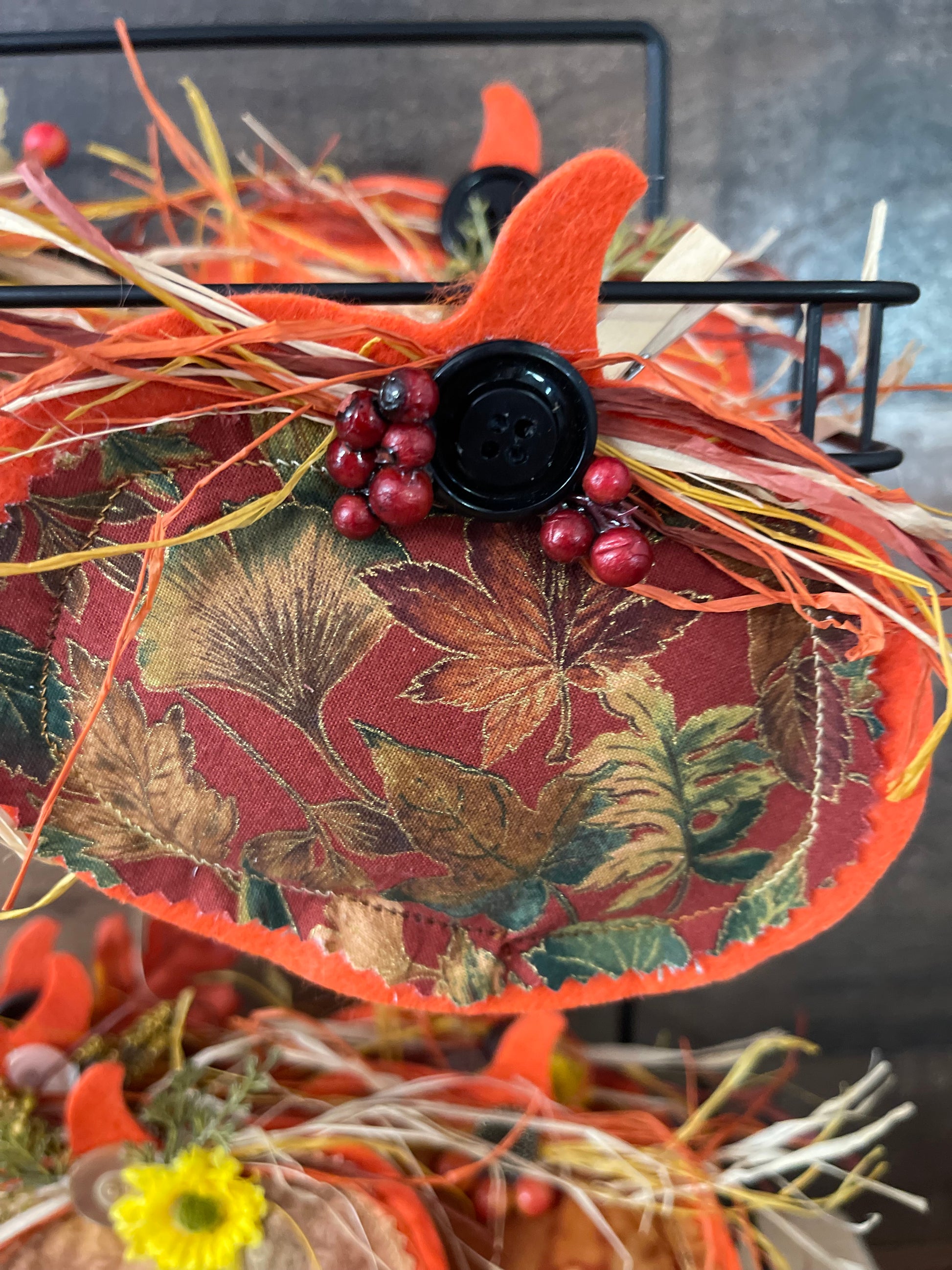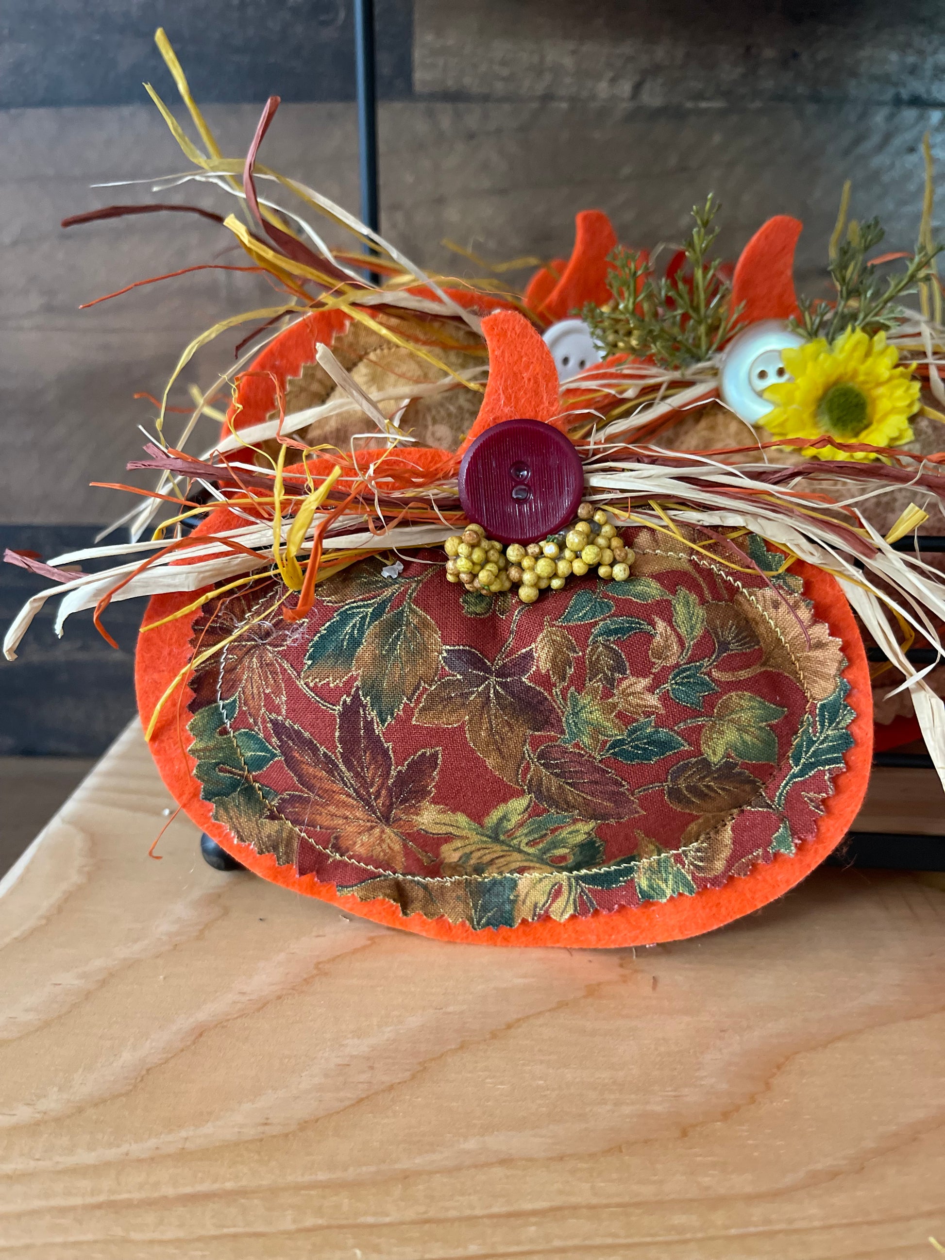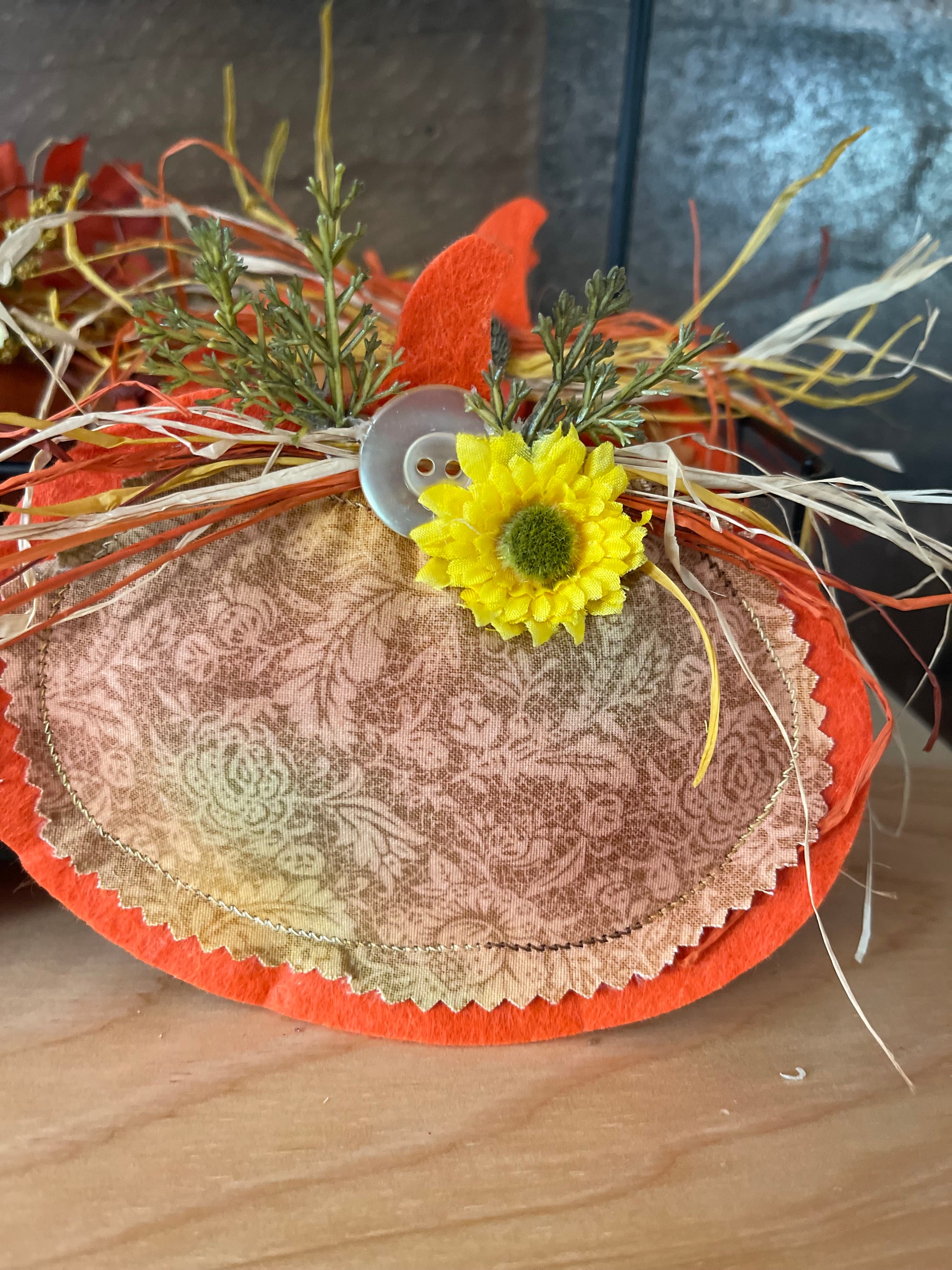 Yellow or Orange felt featuring various fabric patterns machine stitched, fiber filled, and hand-decorated with ornamental decor including faux florals, foliage, vintage buttons, & raffia
