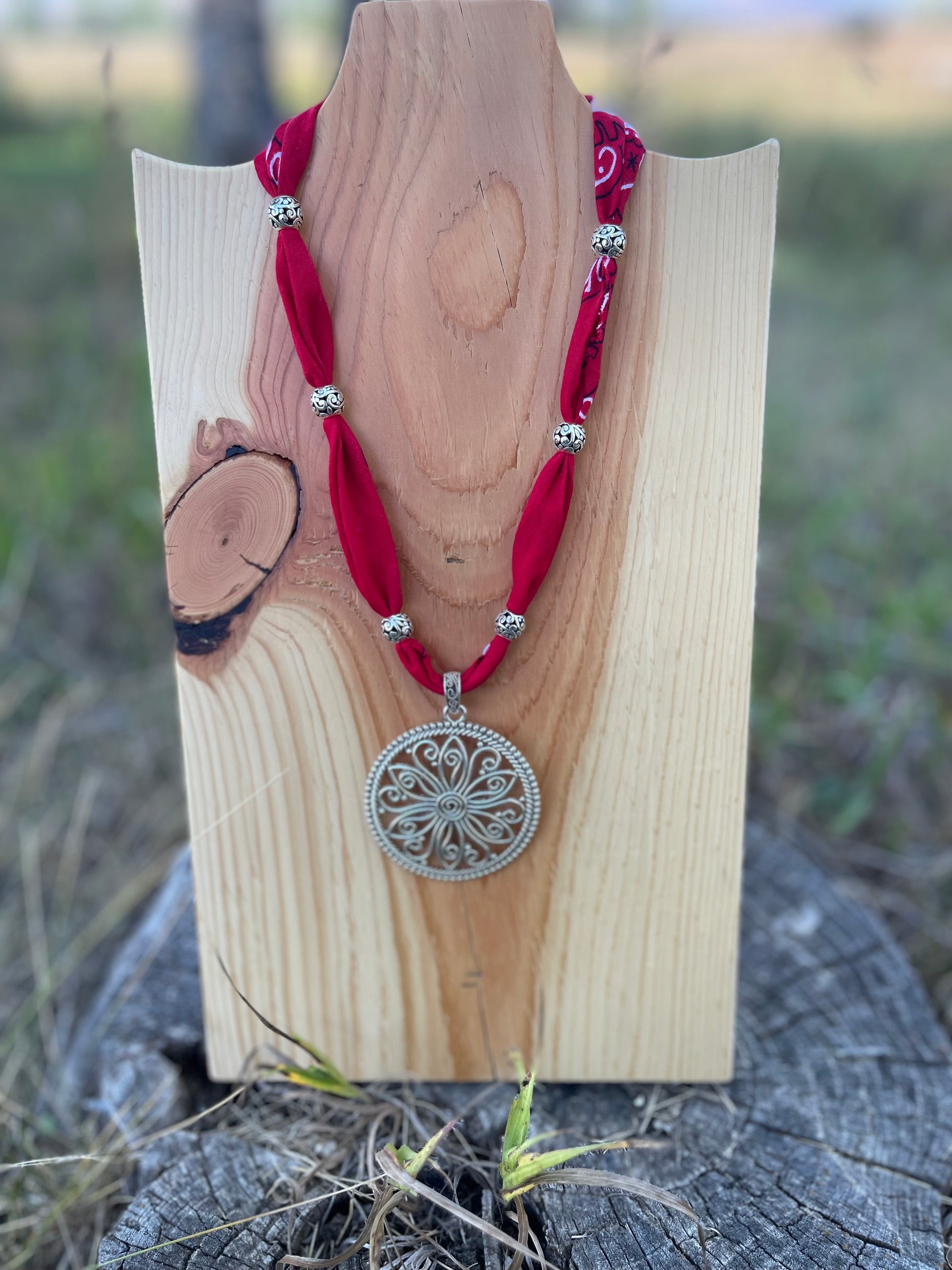 These necklaces are made from cotton bandanas in a Western print and embellished with silver tone beads and medallions.