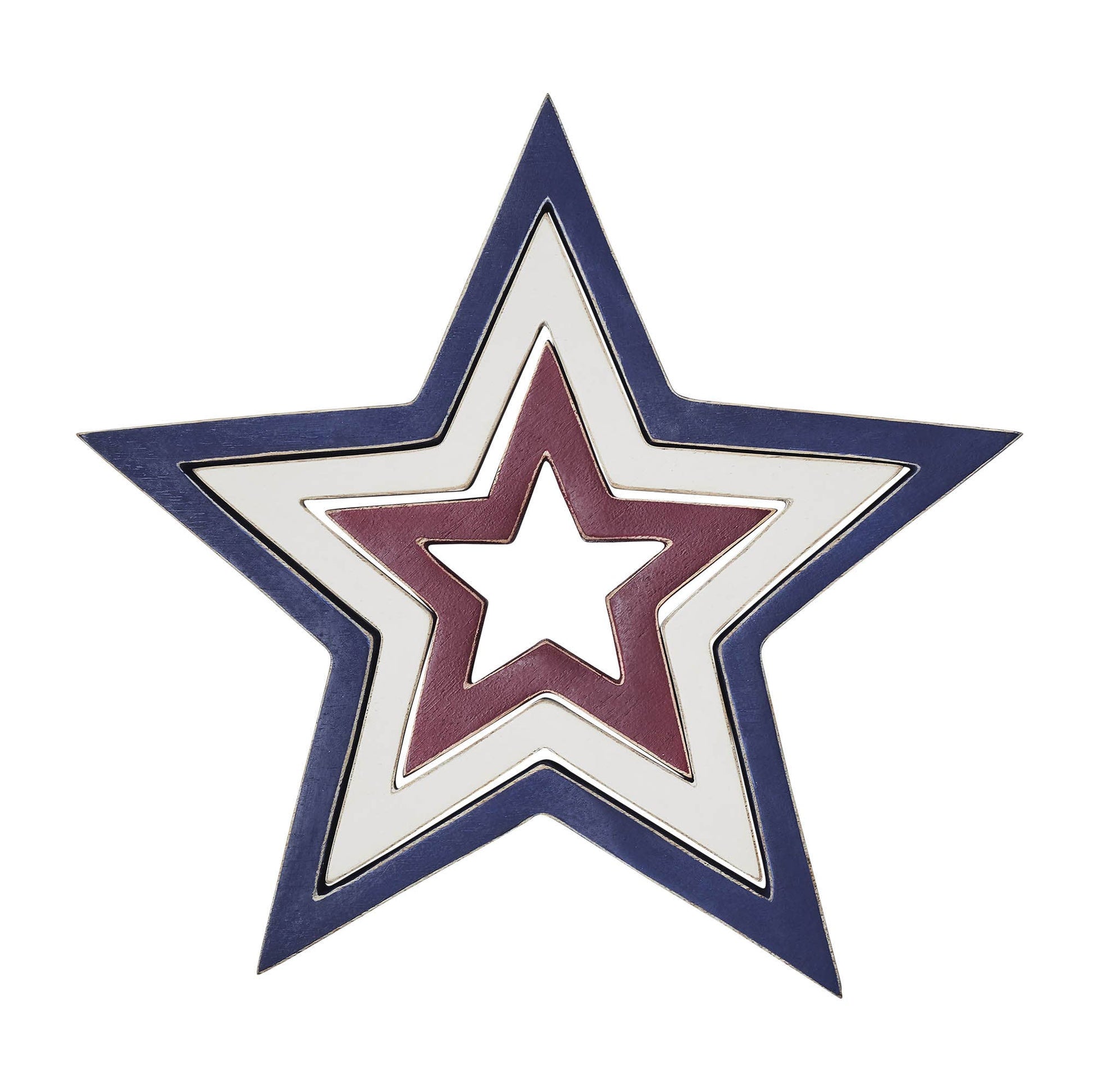 Este encantador conjunto de adornos consta de tres estrellas que se anidan una dentro de la otra y miden en conjunto 10x10x1,5 pulgadas. Fabricada con madera tropical de alta calidad, cada estrella presenta una apariencia envejecida distintiva, agregando elegancia rústica a su decoración.