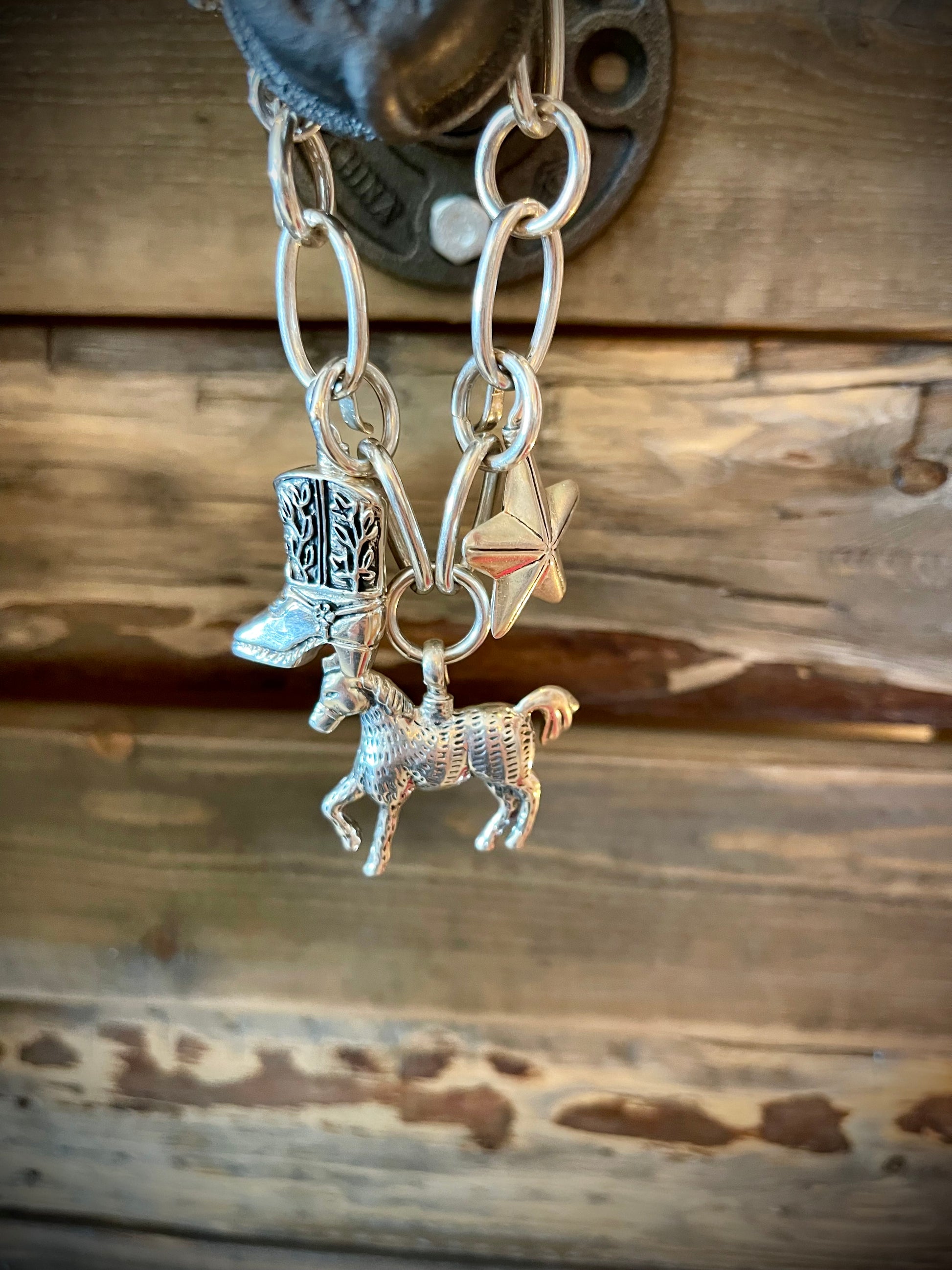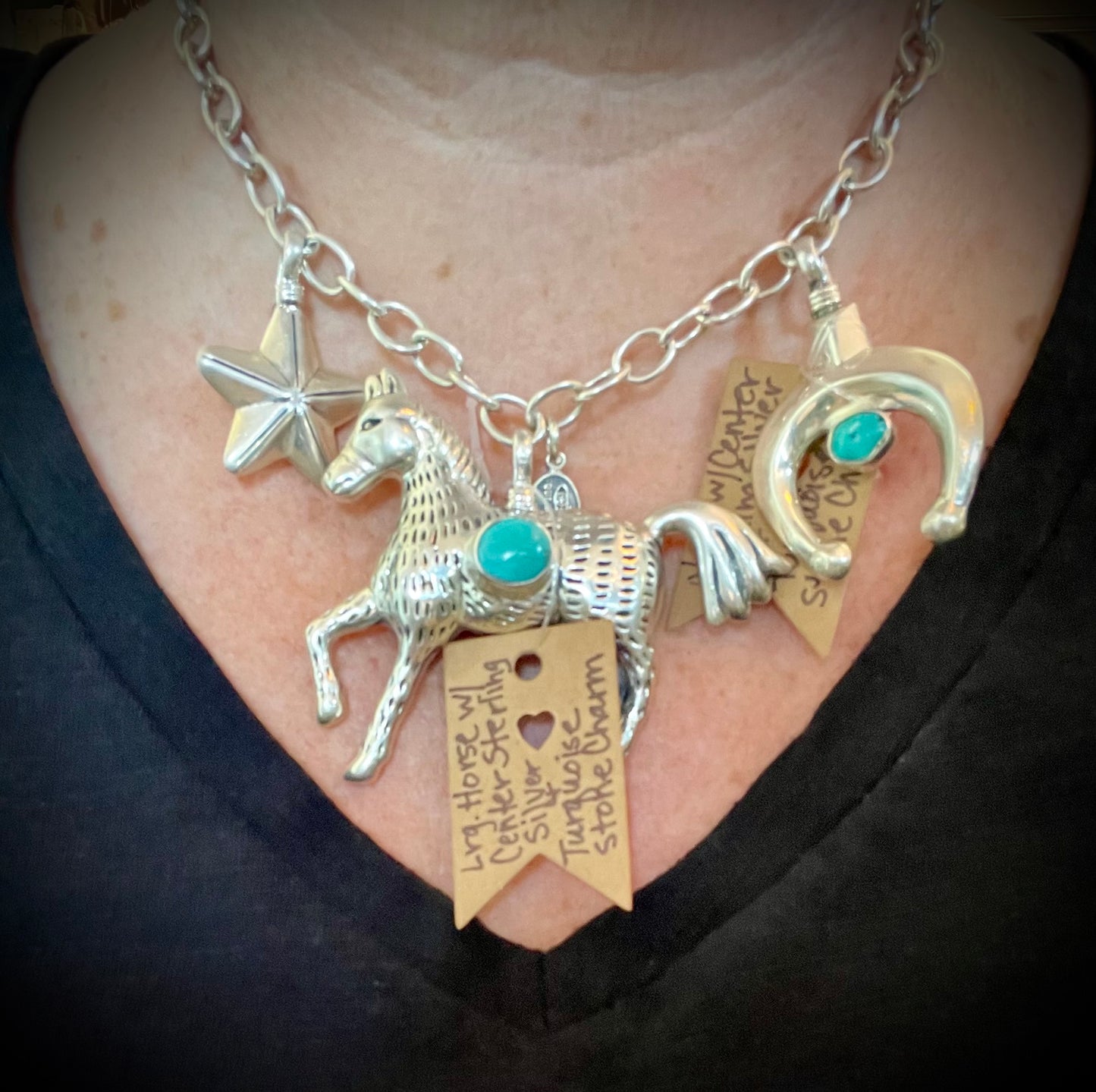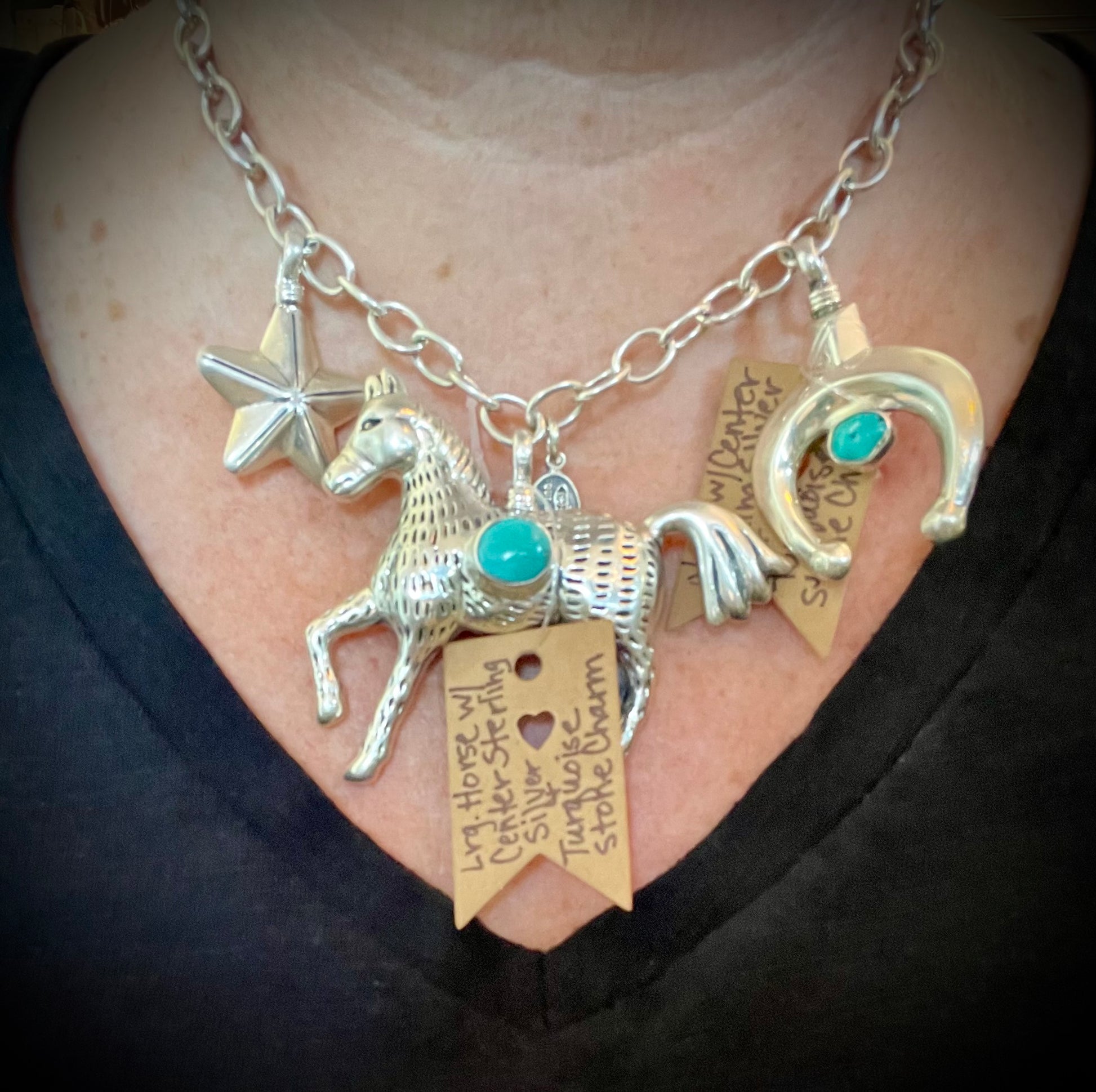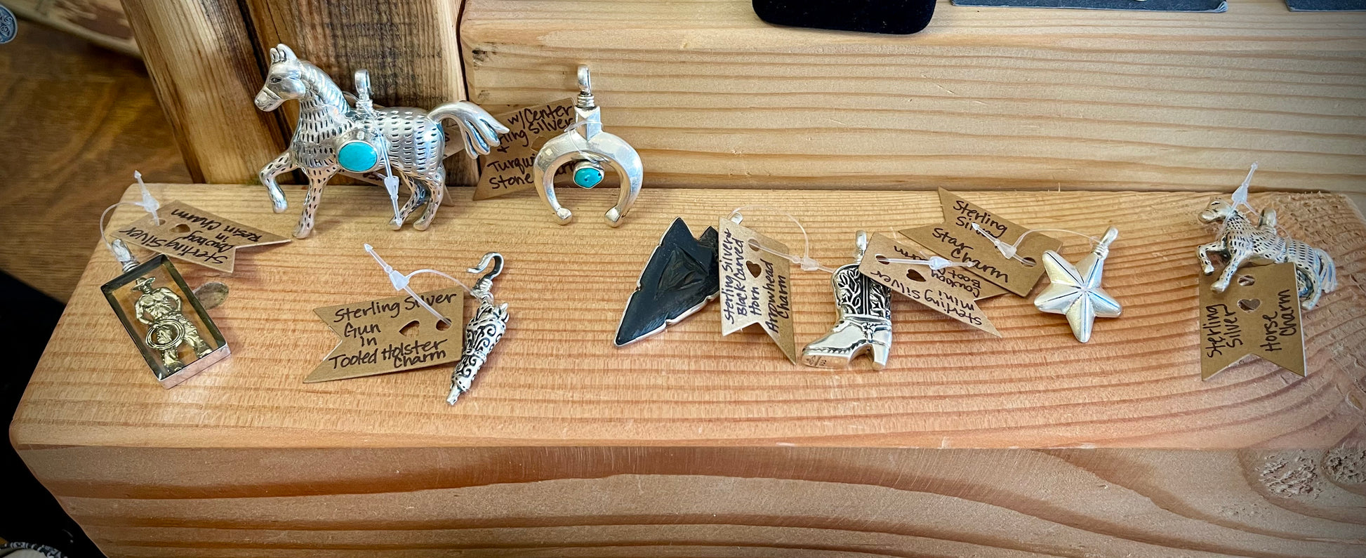 Sterling Silver Charms in various designs including Naja w/Center Turquoise Stone, Black Carved Horn Arrowhead, Sterling Cowboy in Resin, Gun in Tooled Holster, Mini Cowboy Boot, Star, Horse, & Large Horse w/Center Turquoise Stone
