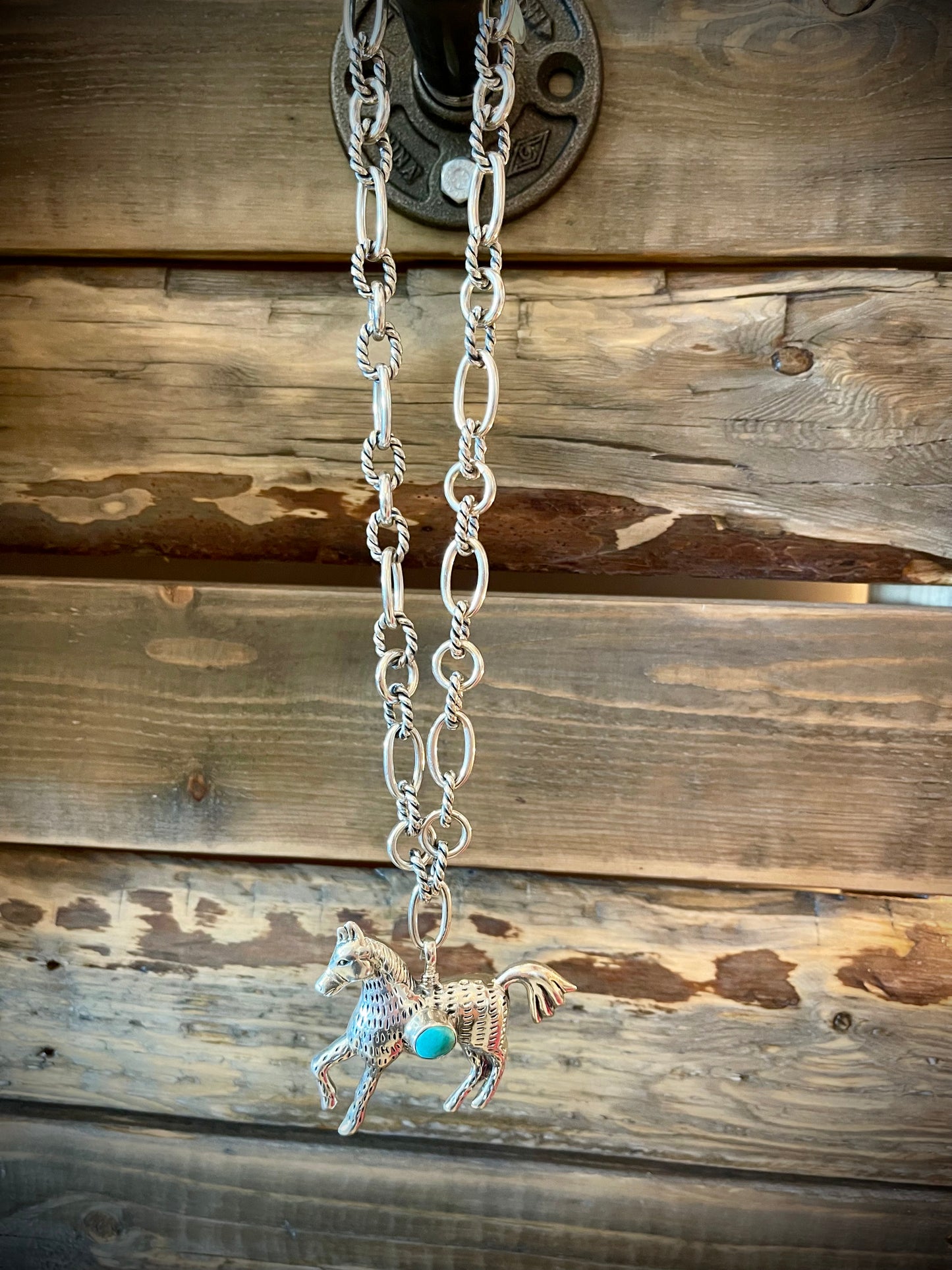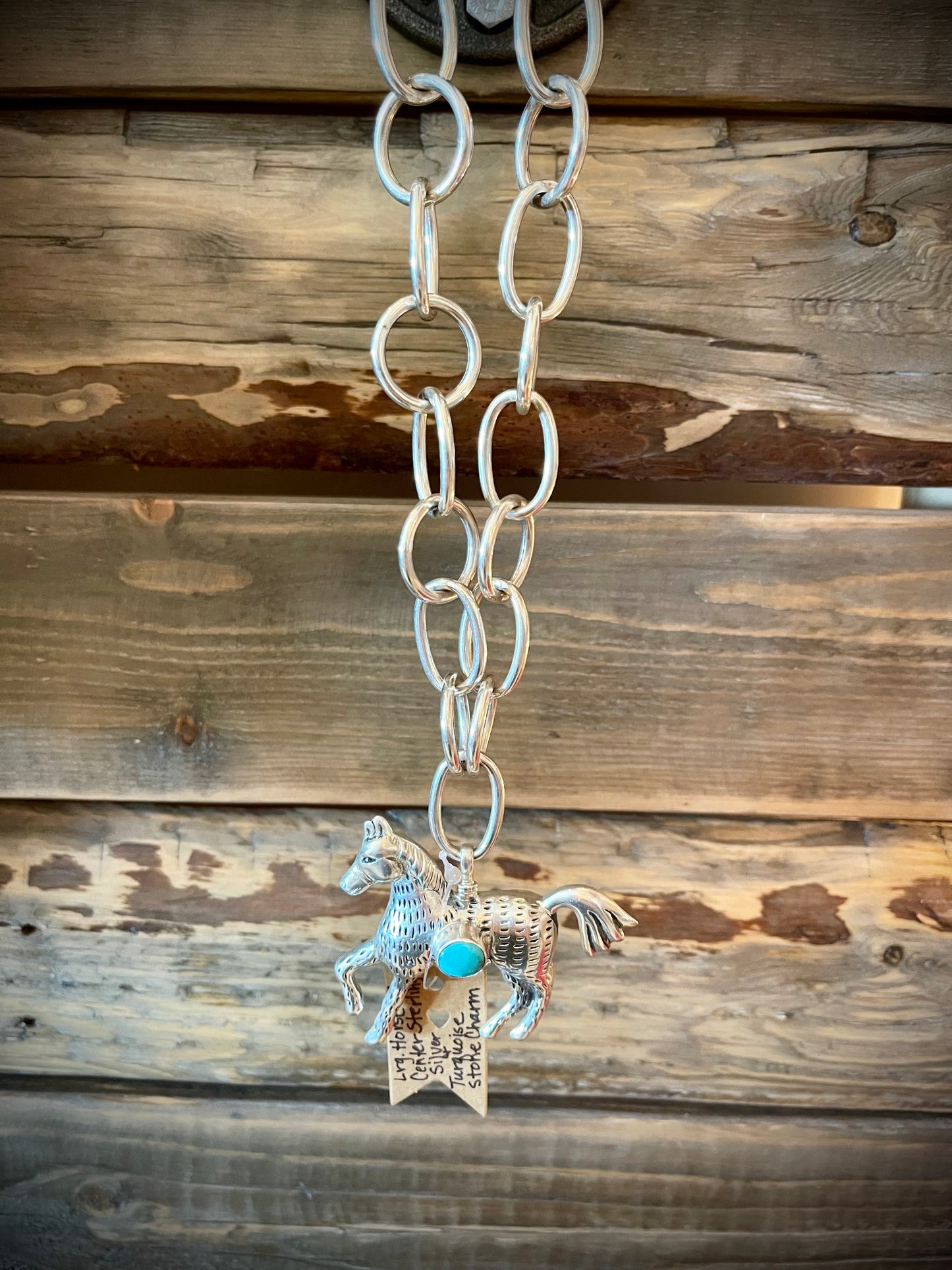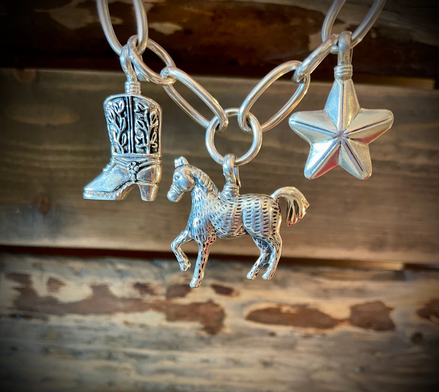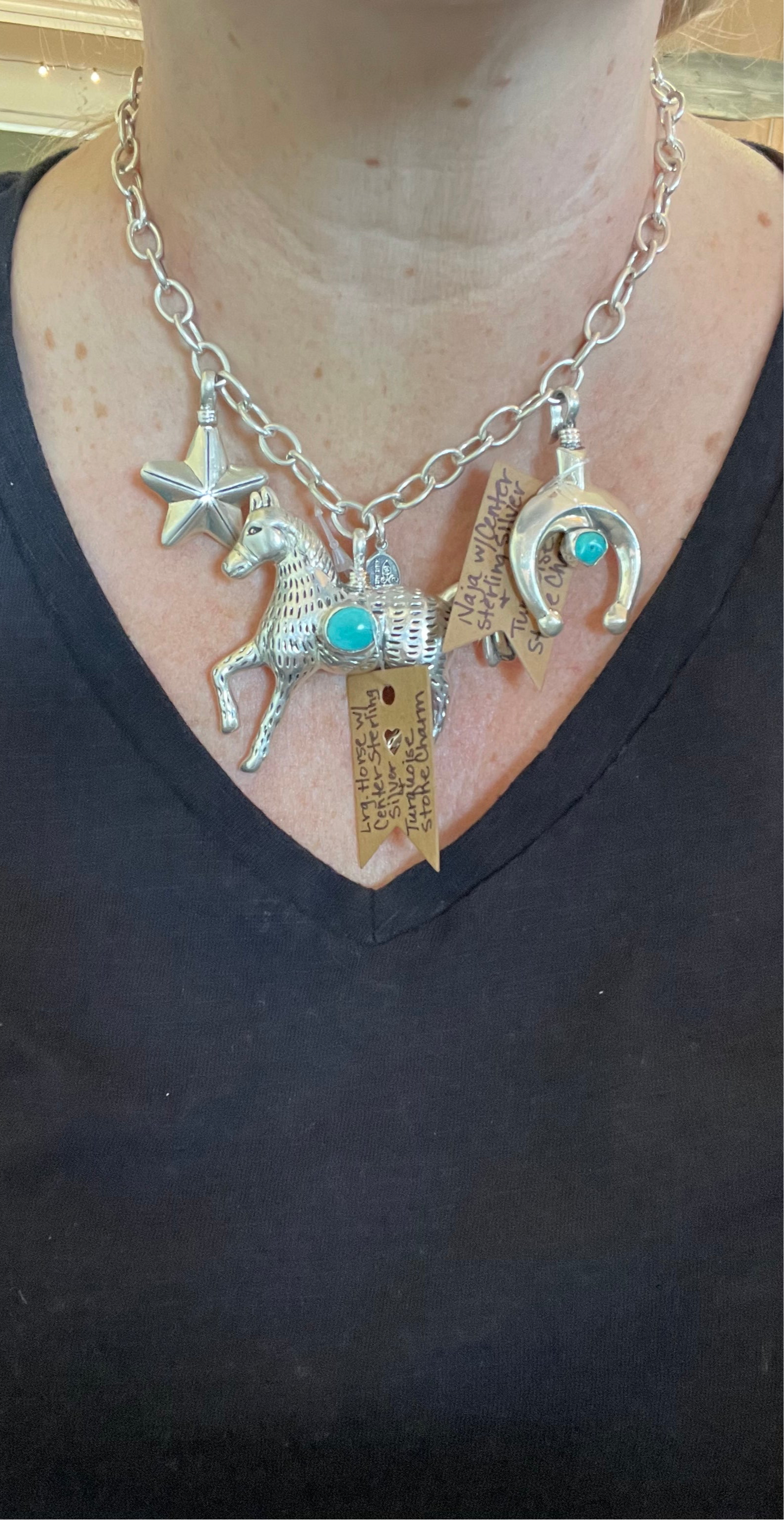 Sterling Silver Charms in various designs including Naja w/Center Turquoise Stone, Black Carved Horn Arrowhead, Sterling Cowboy in Resin, Gun in Tooled Holster, Mini Cowboy Boot, Star, Horse, & Large Horse w/Center Turquoise Stone