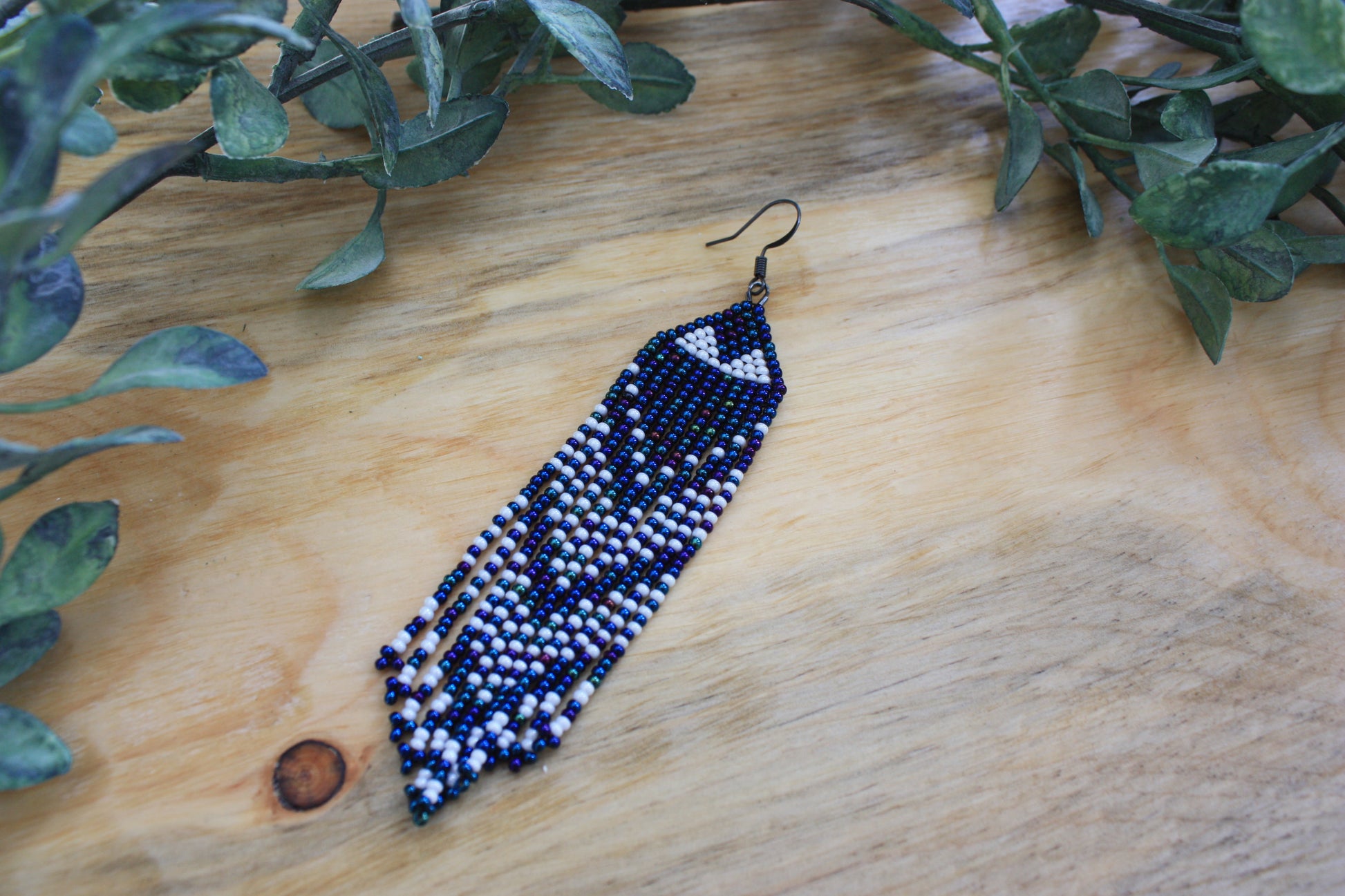 Boucles d'oreilles en perles bleues et blanches irisées avec accents de base triangulaire (2 diamants)