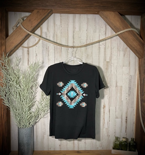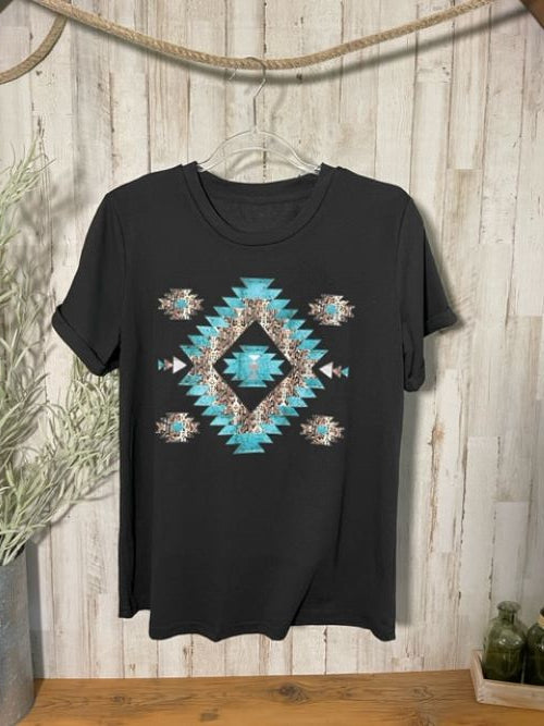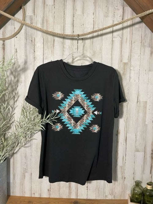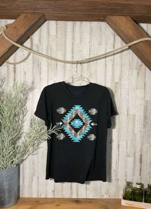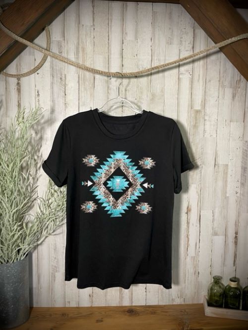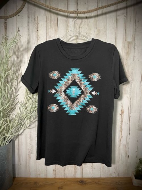 "Southwestern" Turquoise/Silver Printed, Cuffed-Sleeve T-Shirt in Black
